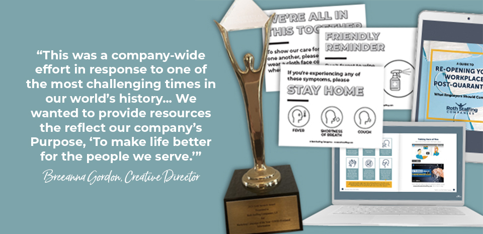 “Roth Staffing did an excellent and strategic job in developing a marketing life plan for business teams that needed immediate support. This was well written, well presented, with wonderful examples of the campaign and provided clear insight to how this campaign meant so much to the many businesses looking for a path to success during these times,” one judge commented regarding Roth Staffing’s entry.